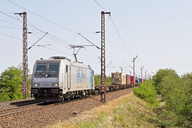 185 684 leaves Hungarian boarder station Hegyeshalom with a freight train to Germany.