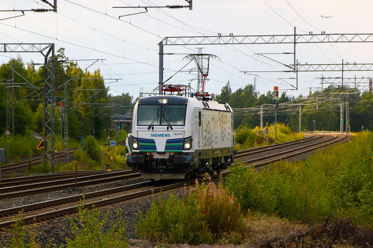Siemens testbed Vectron 193 971 (in Finland called as USr3) on a test run, now coming back to Ilmala depot from Turku.